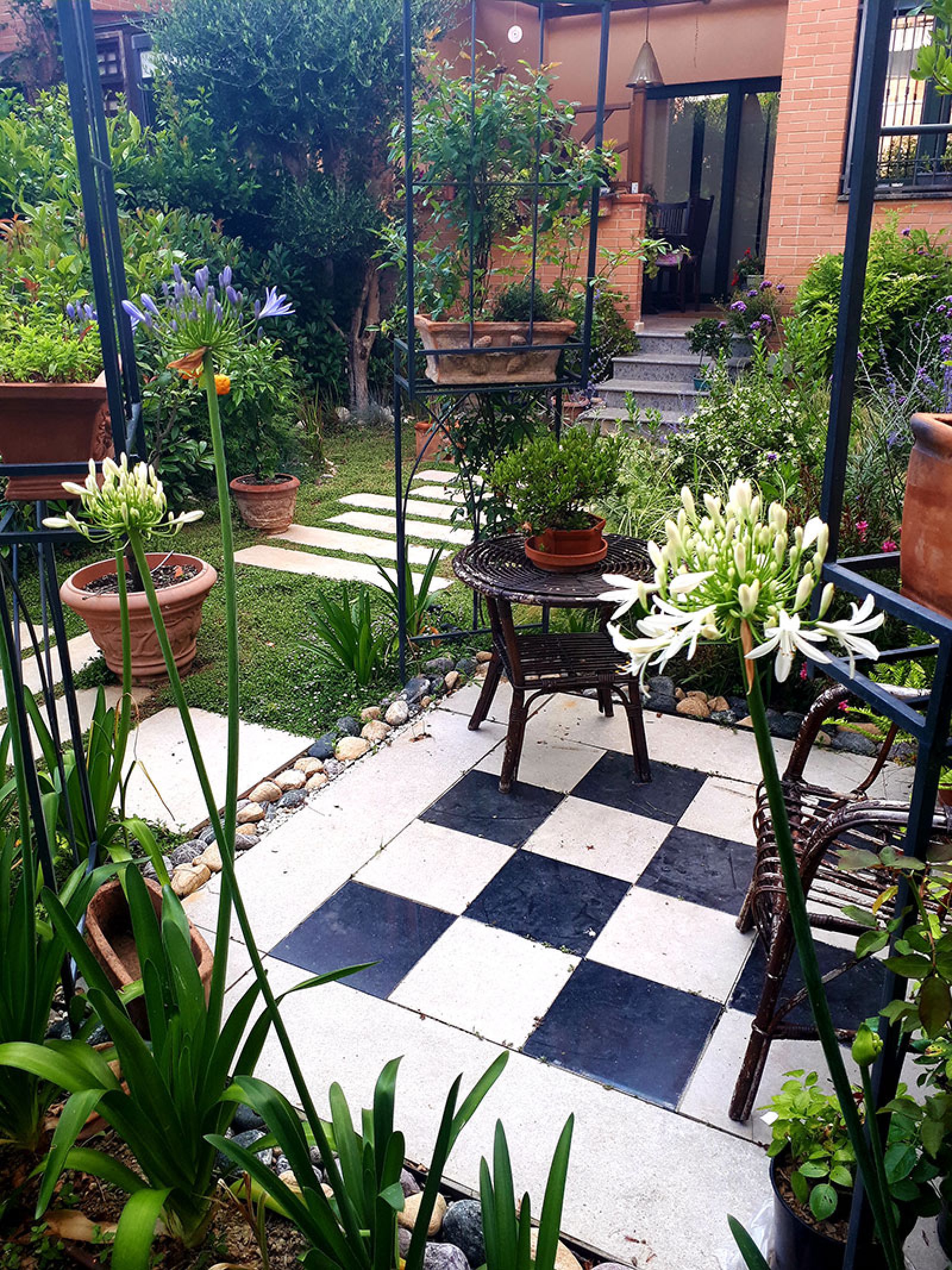Il “Giardino a gradoni” è stato realizzato per una villa privata a Punta Ala, nel Comune di Castiglione della Pescaia. La soluzione compositiva ha previsto la realizzazione di gradoni con blocchi monolitici, posati a secco, che hanno consentito di ottenere delle terrazze lungo il declivio originario. Lungo il profilo dei monoliti sono state inserite graminacee, Agapanthus e altre piante perenni in modo da ottenere un suggestivo parapetto vegetale.